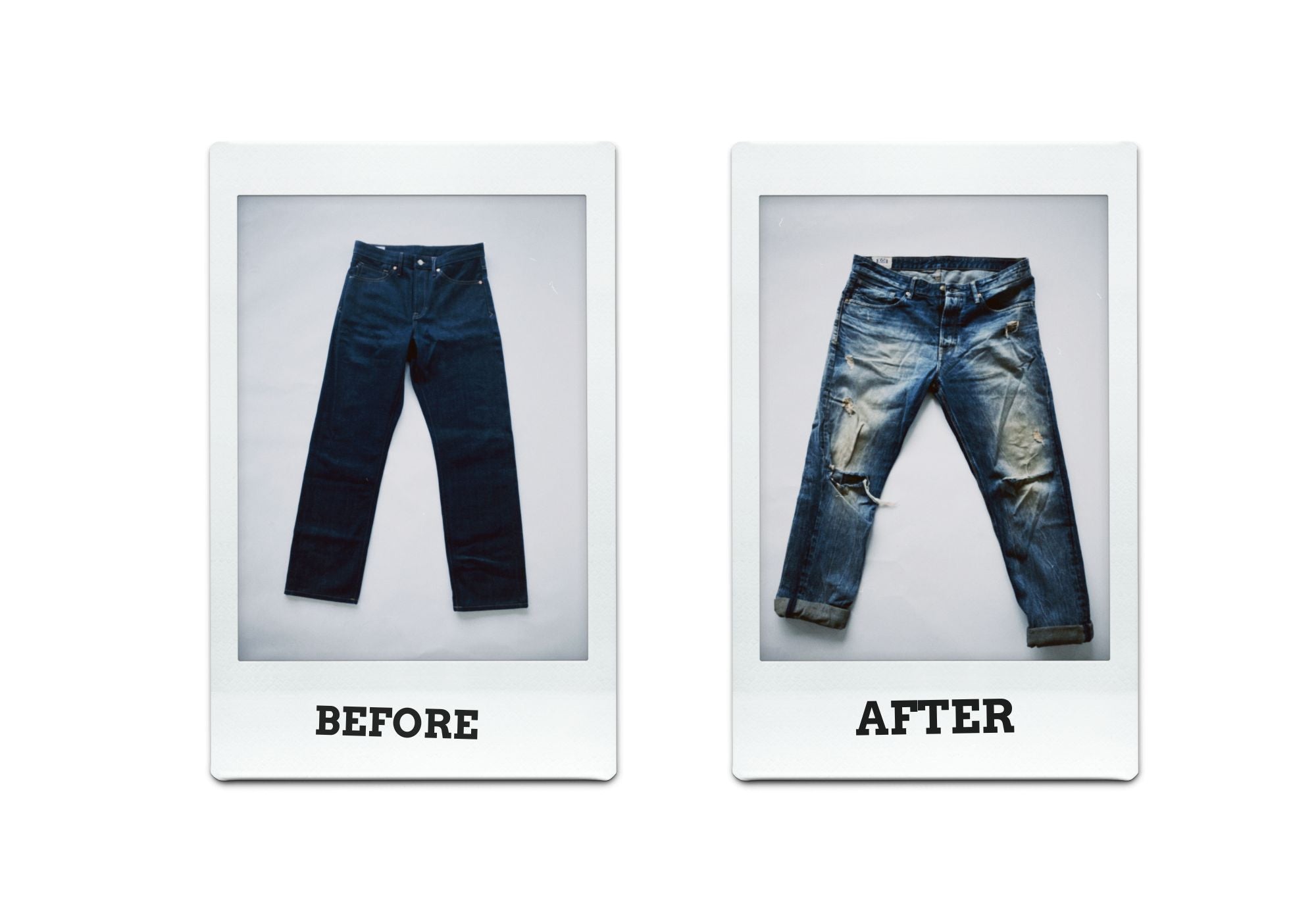 - Leichtes Einlaufen: Raw Jeans können leicht einlaufen. Wenn nötig, dehne sie im nassen Zustand vorsichtig! an den Innen- und Außennähten.